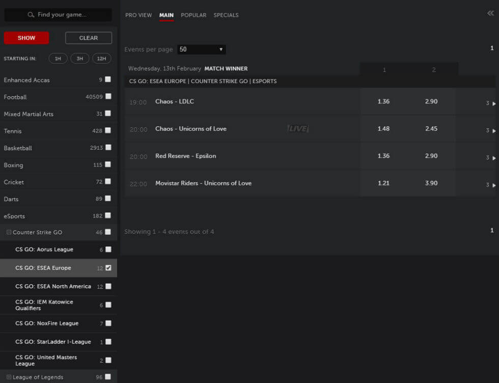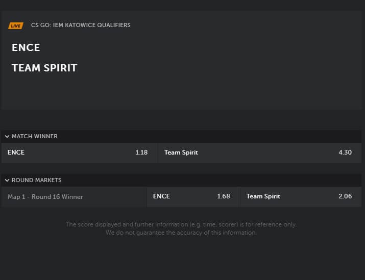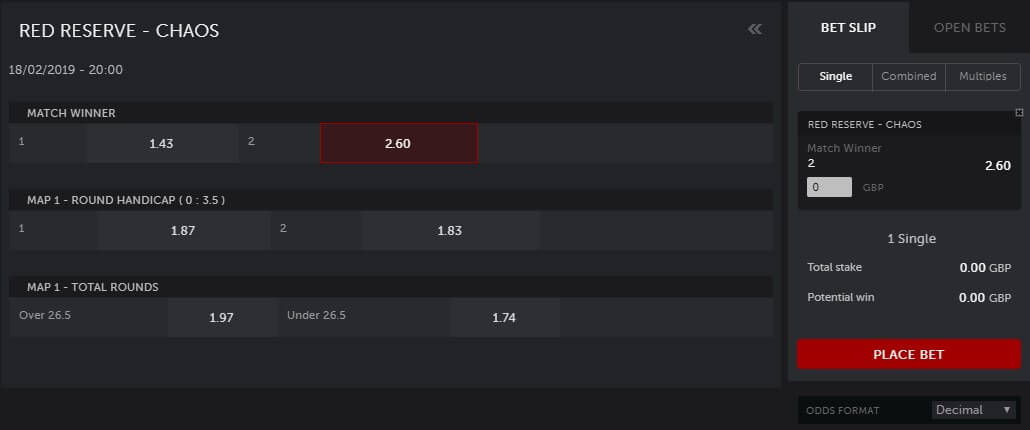 The option for changing the odds format is conveniently located right under the bet slip – the available format types, are Decimal, Fractional, and American. The most popular CS:GO bets that can be made are on Match Winner, Outright Bets, Map 1 Total Rounds, and Round Handicap. Bear in mind, that not all CS:GO competitions are made alike, so it is possible for some markets to have a wider bet variety than others.