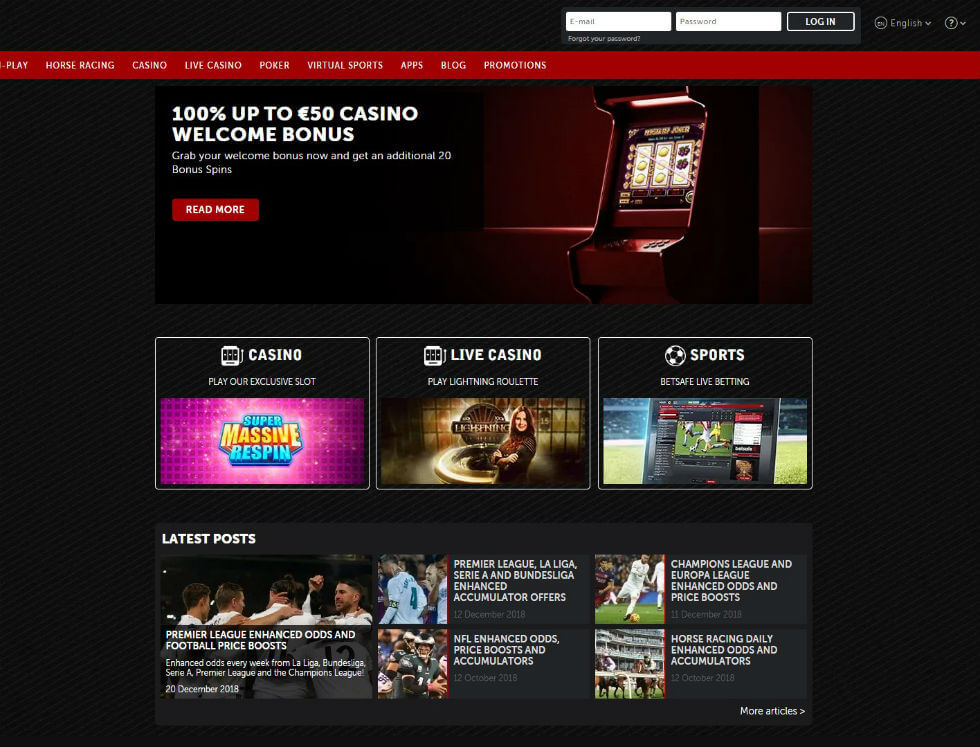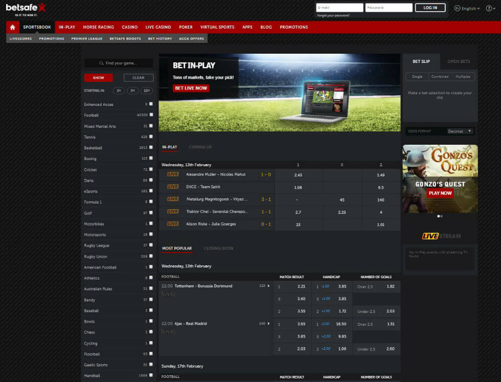 The navigational elements of Betsafe’s homepage are laid out in the classic industry-standard theme for most online bookies. The roster with market sections/sports is located to the left of the screen, in-play and popular markets are displayed on the center panel in the middle, and the bet slip is visible top right. The sportsbook’s navigational panel located on top is painted in deep-red, making it stand out from the overall black-gray visual theme of the website. While adhering to some classic aesthetic rules, the site appears fresh and new.
