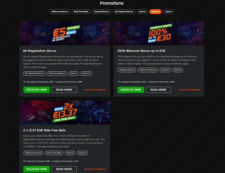 The Esportsbetting.com bonus program isn’t as extensive as we had hoped it would have been. Dubbed “the risk-free bet” bonus, users will have the opportunity to get €13.27 in their account balance. To qualify for this offer, a punter needs to make a deposit of at least €30. The good part? Users can claim this bonus twice, effectively benefiting from €26.54 in bonus cash. There is another welcome bonus that Esportsbetting.com offers to its punters. If you make a minimum deposit of €10, you will grab 100% bonus. This means if you deposit €30, €60 will be added to your funds. Naturally, some terms and conditions apply on those bonus funds, so make sure you inform yourself about them.
